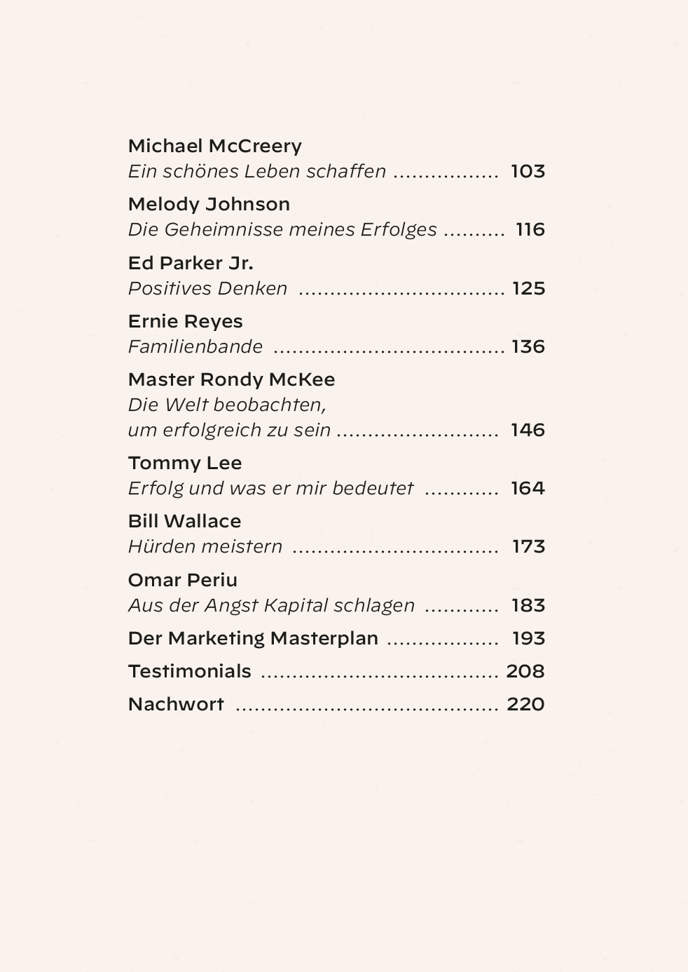 In diesem revolutionären neuen Buch zeigen Stefan Billen und sein Mentorenteam (Greg Silva, Tom Callos, Allie Alberigo, Rob Colasanti, Michael Chaturantabut, Meister Bill Clark, Dave Kovar, John Hackleman, Michael McCreery, Melody Johnson, Ed Parker Jr., Ernie) Reyes, Master Rondy, McKee, Bill Wallace und Omar Periu): Welch erstaunliche Auswirkungen kleine Erfolge auf dein langfristiges Wachstum haben, warum es manchmal besser ist, doch kein Anführer zu sein, wie du in den Hintergrund trittst und andere an die erste Stelle setzt und ein Weltklasse-Team aufbauen kannst.